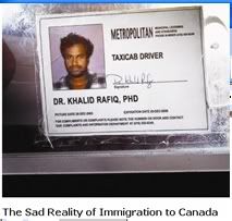 Below : Dr. Khalid Rafiq, is one of the hundreds of thousands of immigrants in Canada forced to survive on the worst labour jobs the country has to offer. A Ph.D. graduate from Pakistan, he now earns minimum wage driving a taxi in Toronto for a living.from http://www.notcanada.com/ home page