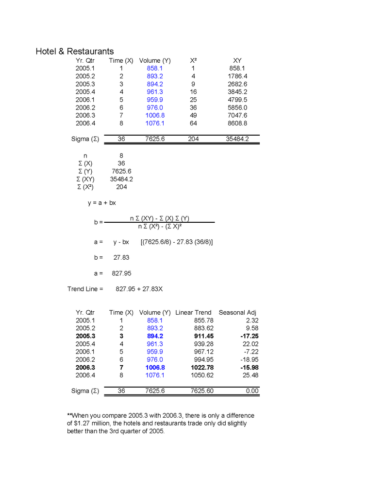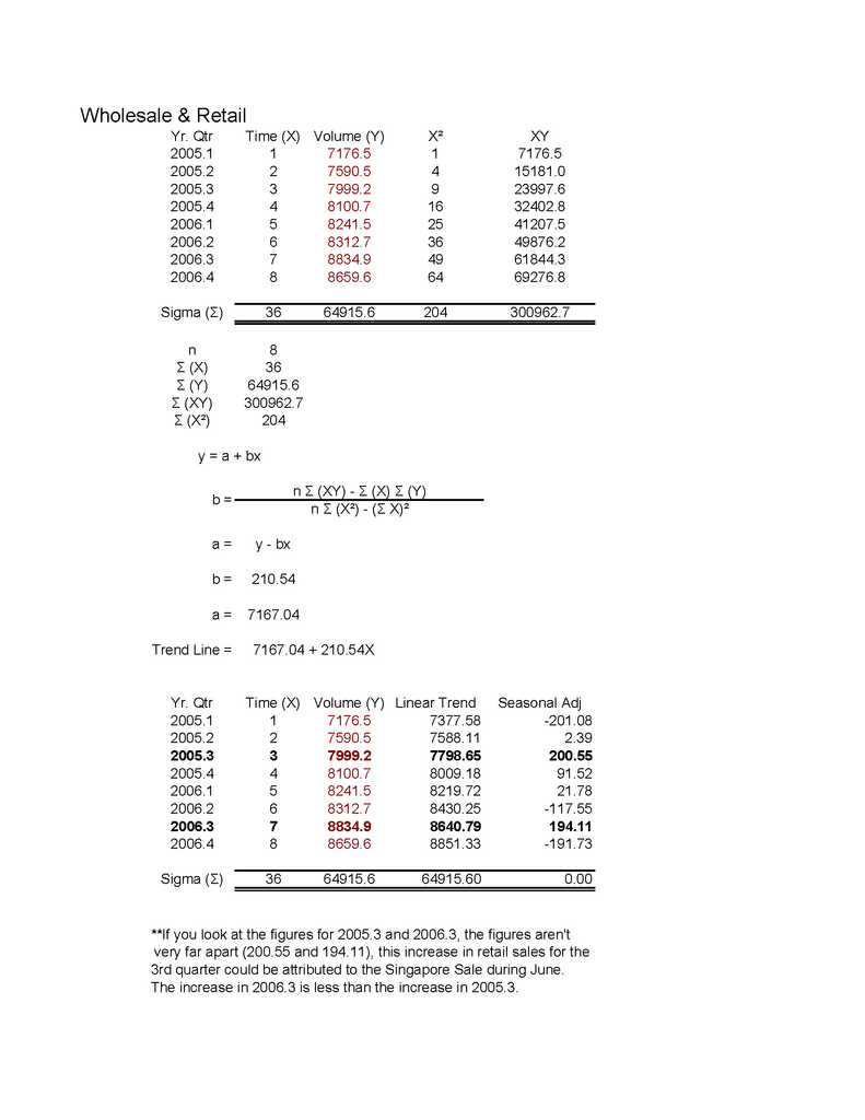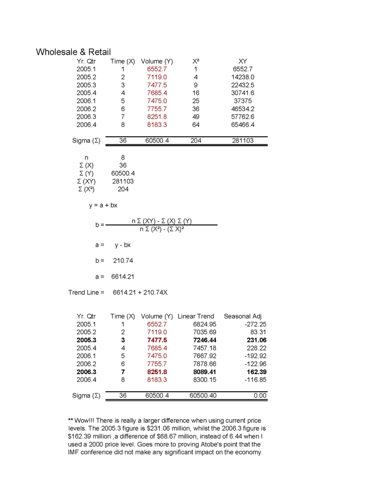 For Gazelle's benefit I have provided the trendline with seasonal factor at current price levels. Apparently the wholesale and retail sector did much worse (about $68.67 million) than with a 2000 price level, as for the hotel and restaurant sector, it only did $1.27 million better when compared to the same quarter in 2005.Originally posted by Gazelle:because you didnt realise that the PDF file which you extract your numbers from has 2 pages. page 1 is 2006 price while page 2 is 2000 price. Hence if you try to use 2000 numbers to determine the outcome of 2006, dont you think that you actually lack a variable that connect 2000 figures to 2006?