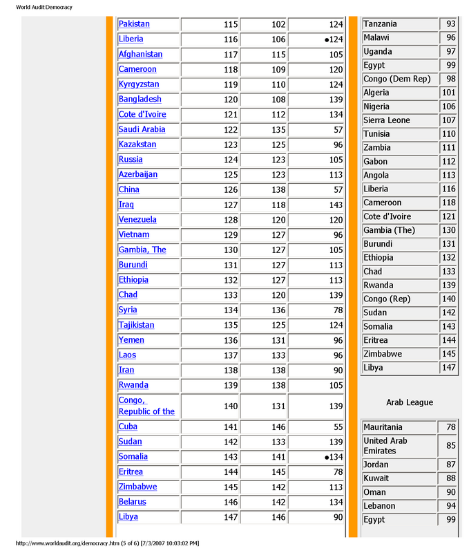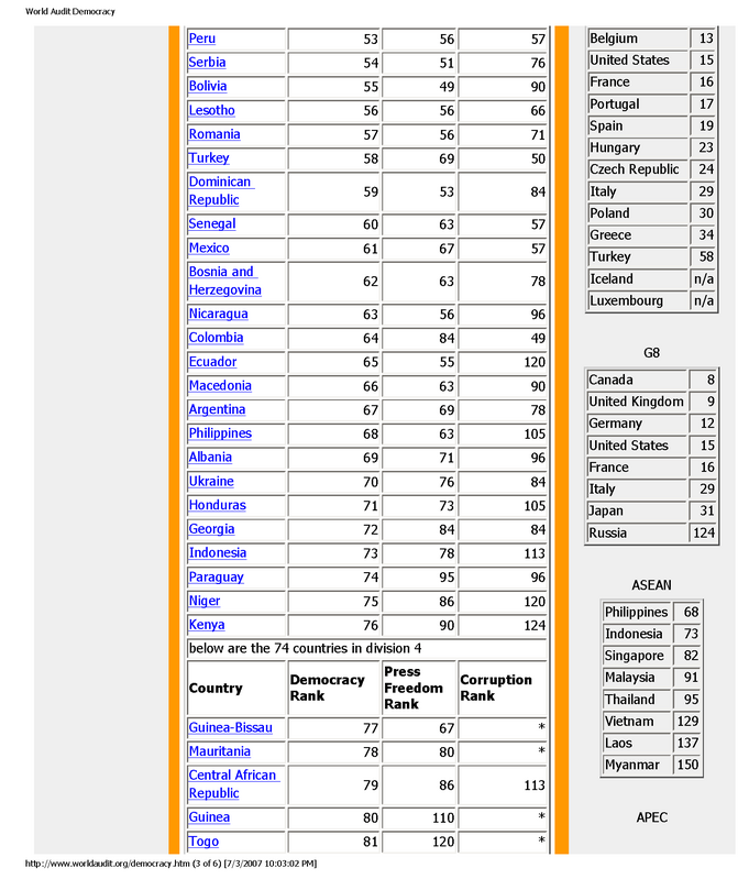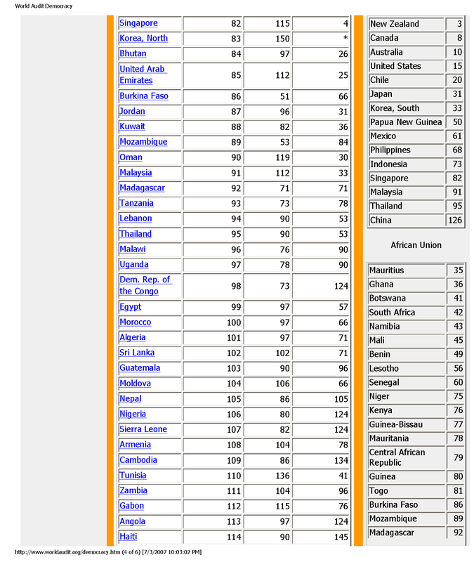 seems like we're the only 'first' world country ranked amongst third world nations ...Originally posted by maurizio13:Interesting to note that World Audit on Civil Liberties ranks Singapore 1 rank above North Korea (DPRK) in terms of democracy. Apparently another older report puts Singapore at 2 ranks above North Korea. Singapore is ranked 82 in this current report.