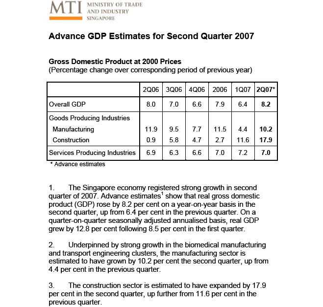 "The Singapore economy registered strong growth in the second quarter of 2007," it said.