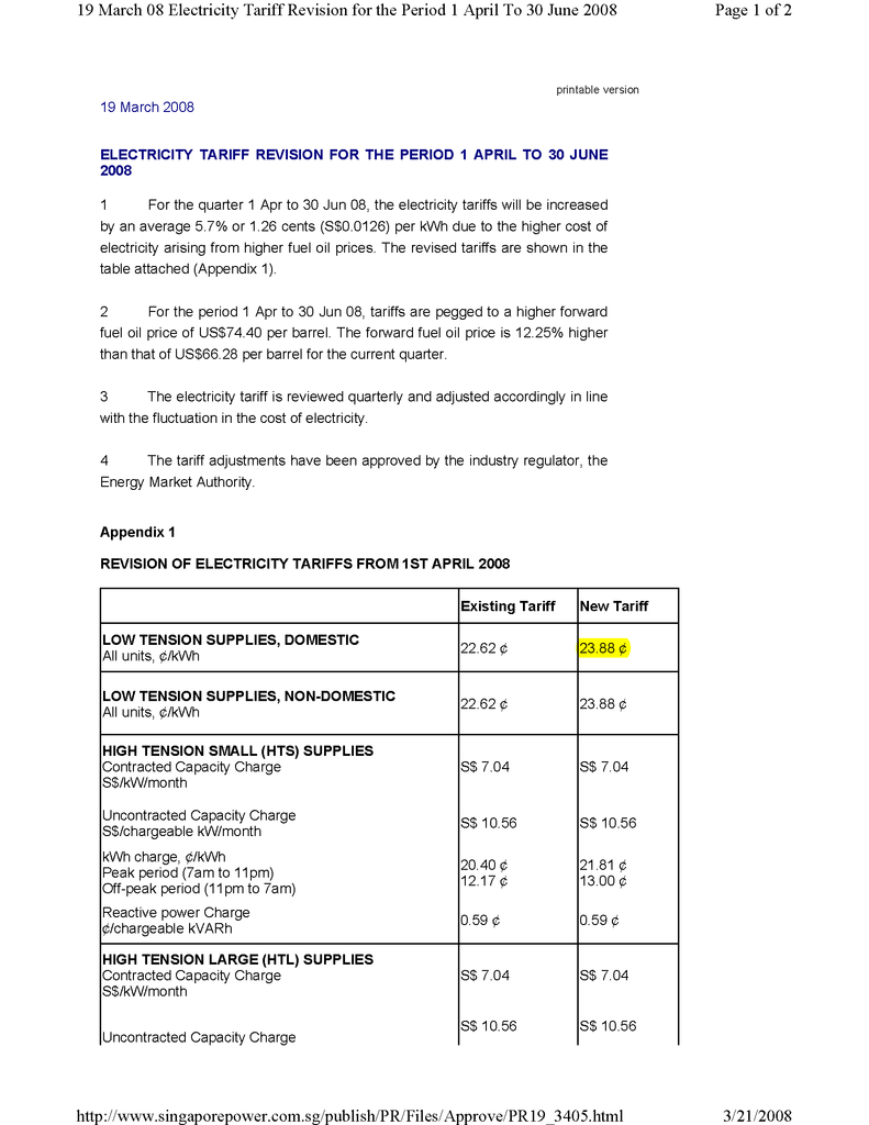 Singapore Power charges electricity rates 23.88 cents.