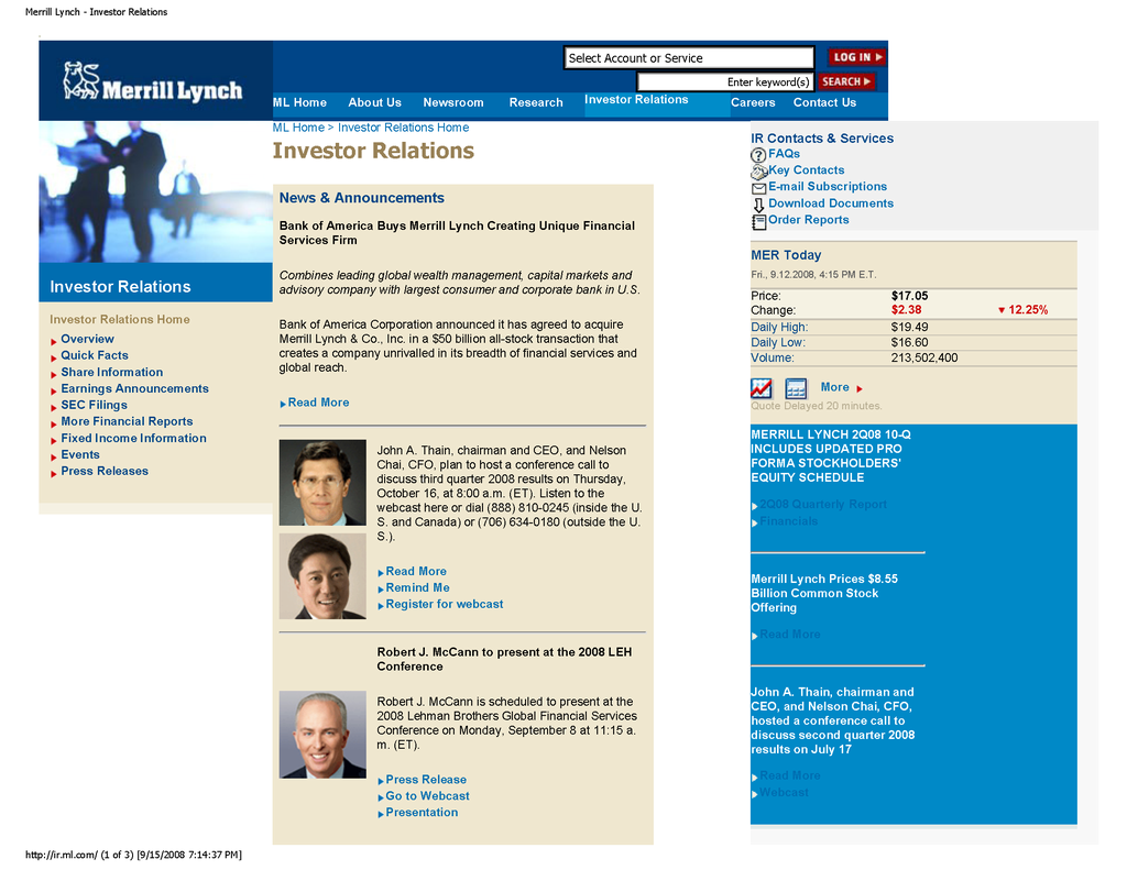 Originally posted by redDUST:NYT reported that ML is negotiating with the Bank of America for a `rescue plan' to avert a Lehman Bros.