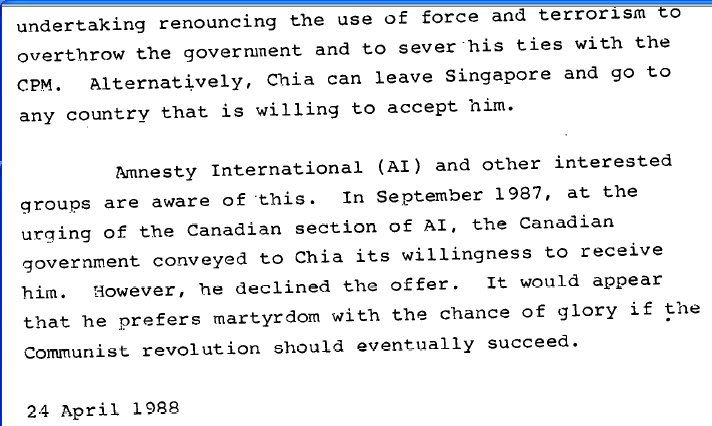 Chia was given the same deal, but he refused to sign the document as he feels that doing so will mean he admits to advocating violence and being part of CPM before, thus the 32 year saga.