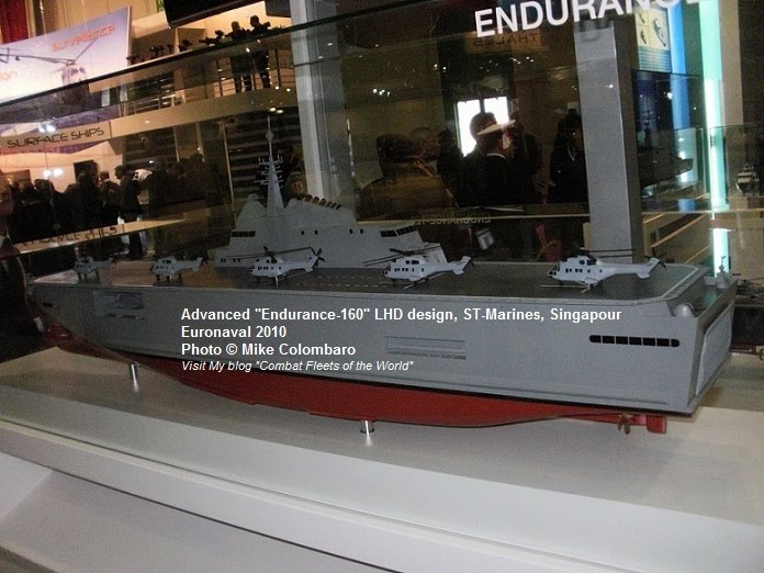 In late 2010 Singaporean naval yard Singapore Technologies Marine (ST Marine) unveiled a new variant of its Endurance-class Landing Platform Dock (LPD). The new Endurance 160 design is a 14,500 ton warship with a full length flight deck. The length overall is 163.7 meters, with the flight deck around 146m long by 25.6m wide with five deck landing spots. The RSN had encountered the Italian Navy's 133-meter long San Giorgio-class LPDs in the Persian Gulf during Operation Blue Orchid 1 and came away impressed with the capabilities packed into the compact hull form.