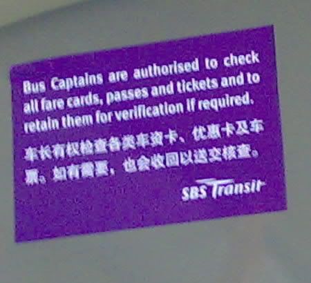 "Bus Captains are authorized to check all fare cards, passes and ticket and to retain them for varification if required."Originally posted by Y_Shun:authorized to check....but can they keep it?