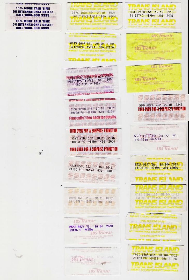 that's weird... 365 (TIBS) had 365 and 365A tix...at the same time....Originally posted by vivienlee:Last time when SBS/TIBS had PAC svcs the AC tickets will normally have an "A" printed after the bus svc no, depends on the bus driver how he keys in the svc no. The NAC buses juz show only the svc number, same applies to those FAC svcs, juz show only the svc no.