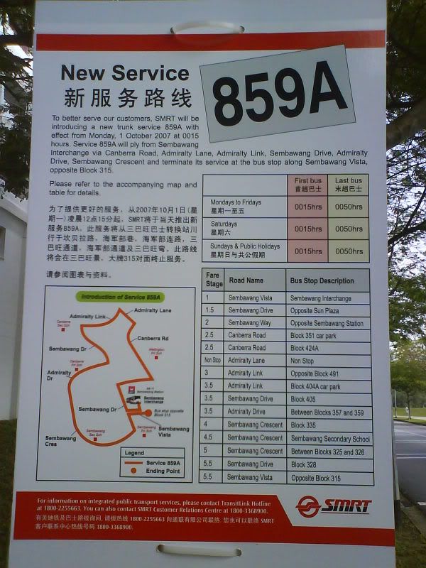 but i thought 859 is trunk service? but no matter, Sembawang has no feeder serivces anyway. this reminds me of 858, where the last few trips terminate at Yishun not Changi Airport.Originally posted by tintinspartan:From 1 October, 859A will be introduced from 1215 am till 1250 am. This new shortroute will ply from Sembawang Int till Sembawang Vista (Bus Stop outside Sembawang Bus Int) in Yishun Direction.