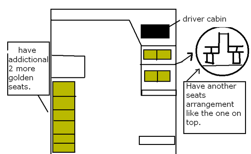 2 more "golden seats" on the left not be possible due to the axle and the position of the exit door, unless u wan the seat to be suitable only for an infant to seat. On the right behind the BC is a possible, considering the standing area will be reduced abit.