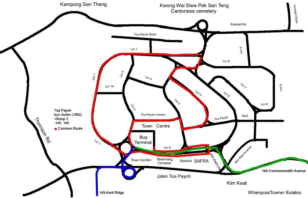 Toa Payoh in 1982 basically had trunk services serving the whole town, these bus services go one big round (or sometimes rounds) in Toa Payoh, acting as feeders, before going out of Toa Payoh to their destinations. The only feeder service, 230, serves the then relatively new Lorong 8 Toa Payoh Estate.