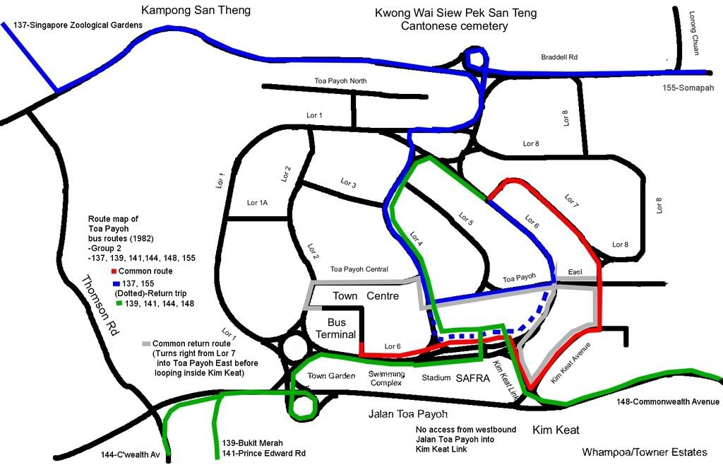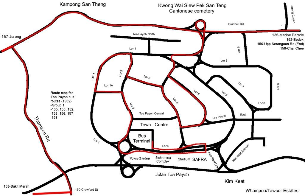 Bus services in Toa Payoh in 1982 generally tend to be in groups according to where they go in Toa Payoh.