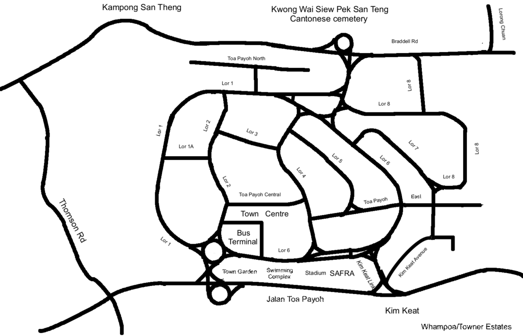 As seen from the map above, there are two roundabouts in Toa Payoh, one of them is the more famous (cos its near the town centre) Toa Payoh roundabout at the junction of Lors 1, 2 and 6, the other is a bigger one located at the northern part of the town, at the junction of Lors 1, 6, 8 and the slip road (now renamed as part of Lorong 6) leading to Toa Payoh North flyover.