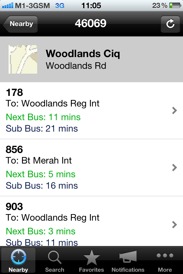 Originally posted by lemon1974:do you know that this SMRT iphone application is totally useless? standing at marsiling block 305 area, clicking on location to find nearer bus stops, show me bus stops along mandai road one time, buses stop at the zoo another time, buses stop along woodlands rd also came out... and another time show me that the nearer bus stop is 500m away instead of the one near to marsiling MRT station...