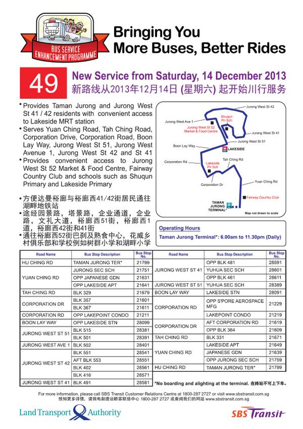 The new loop service 49 will run from Taman Jurong bus terminal and ply area roads like Yuan Ching Road, Corporation Drive, Corporation Road, Boon Lay Way, Jurong West Street 51, Jurong West Avenue 1, Jurong West Street 42. It will run daily from 6am to 11.30pm.