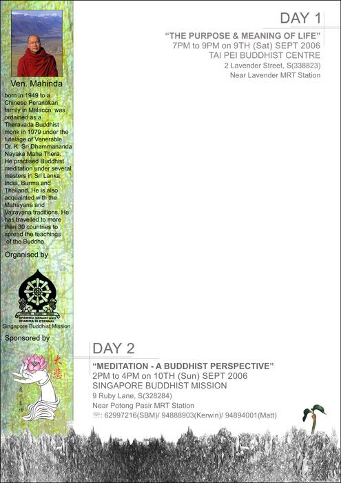 10 September 2006 (Sunday)Meditation - A Buddhist PerspectiveVenue: Singapore Buddhist Mission