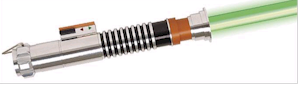 N STOCK. Only a few left. Official reproduction of Luke Skywalker's lightsaber from Star Wars: Episode VI: Return of the Jedi. Glowing, bright green blade ignites with realistic power-up, and power-down lights effects. Authentic lightsaber sound effects digitally recorded from the movie. Features motion sensor controlled sound effects: power-up, power-down, idle, movement, and clash. Durable yet light body looks and feels like a real lightsaber. Sturdy polycarbonate blade is permanently attached to the hilt. Uses 6 AA batteries, not included. Includes display stand.