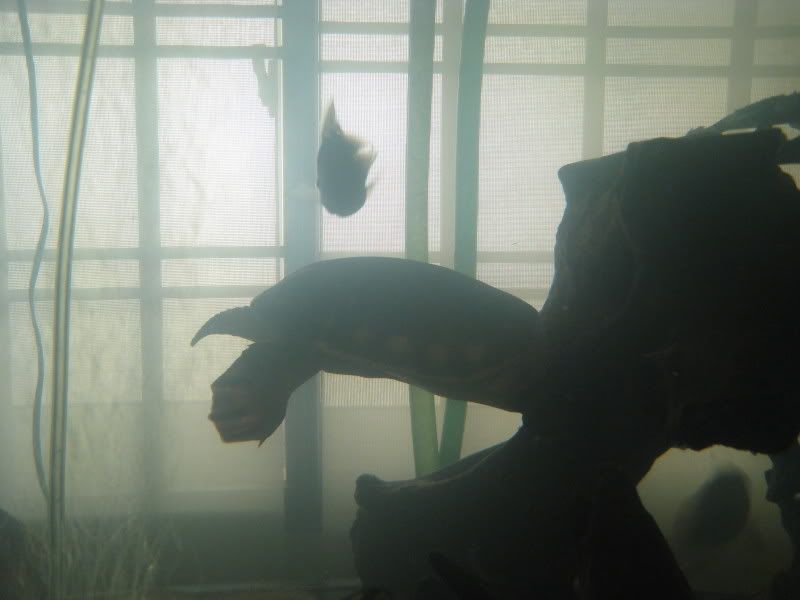 The Cichlids usually fight amongst themselves only and Piggy took a sniff at her, then he went to sniff the fish shit and ate the fish shit -_-