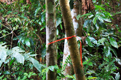 Just in case we needed to find our way back from the way we came, we decided to use a ball of raffia string to mark our path as went along. But with the dense plant growth all around us, we wondered if we could even find these marked trees if we needed to. Laying a trail proved somewhat time-consuming as well, and when we soon found plastic bags tied to trees in the same fashion by others, we stopped doing that near the site.