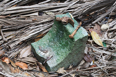 As per what others before us discovered, the place had really been leveled to the ground. All that was essentially left of the site, was this stone basin that was said to have been a purification tub located at the entrance and supposedly carved from an actual granite boulder there. And ruins. And many holes. Some of the smaller holes appeared to have been for the foundations for a small shelter for the tub. Other bigger holes appeared to have been intentionally dug by others and one even went directly under the tub! Perhaps there were diggers looking for the legendary Yamashita's Gold after all. There were signs of many visits by people. In addition to plastic bags indicating the entrances and exits from the site, there was a badly corrugated hammer head and a nail placed on a piece of ruin. And a picture of the Buddha under a tree. Hmmmmm.