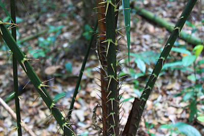 Springing from the floor of the forest, grew this young sapling, which would probably one day grow to the height of its surrounding brethren. Without spikes too I hope.