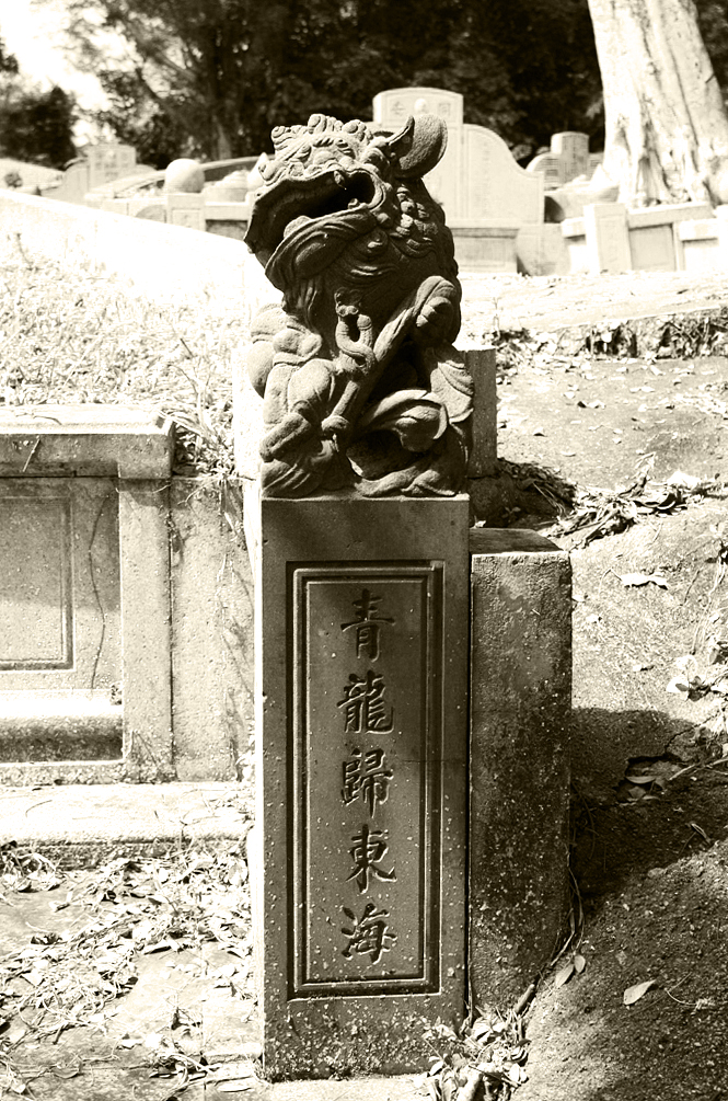 These typical tombstone with the horseshoe heads and a drainage system are typical Hokkien-styled tombs. Chinese businessman tombs have "fu shen" stones guarding the tombs while ordinary Chinese have "hou tu" as their guarding angel on the left of the tomb.