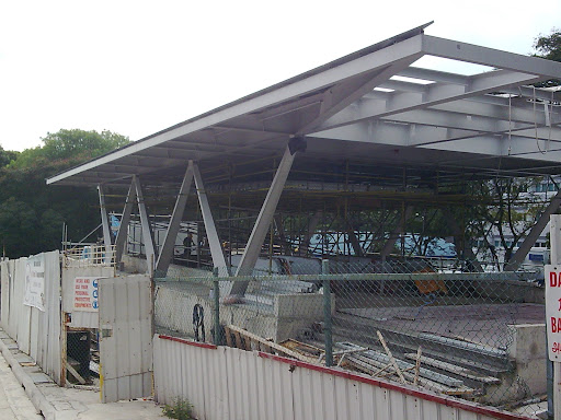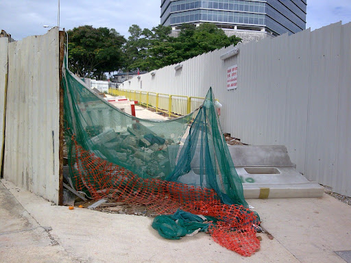 road reinstatement in progress, station exits/ventilation shafts are under construction. construction site still quite messy
