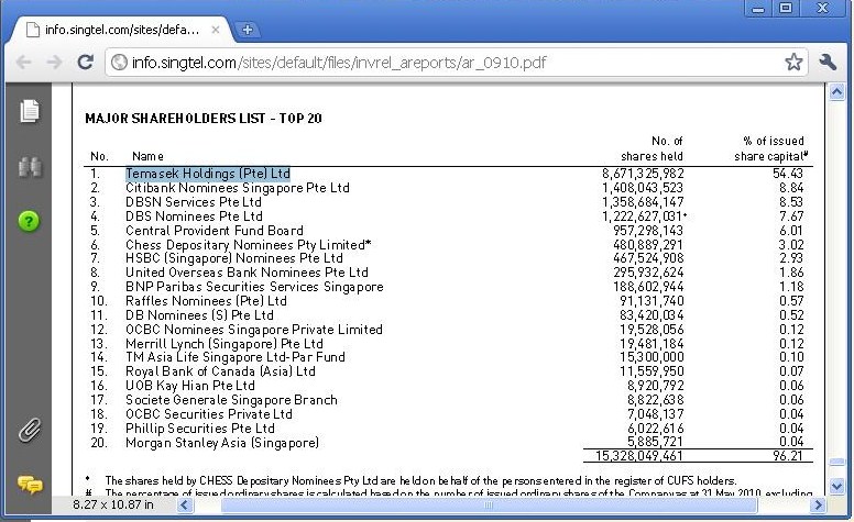 spurring my curiosity into exploring Singtel's 2009/2010 annual report [link][pict] to check out if besides engaging in the cut throat commercial profit, Singtel, a publically listed company majority owned [pict] by state funded Temasek holdings [wiki], was as much active in its performance of CSR.