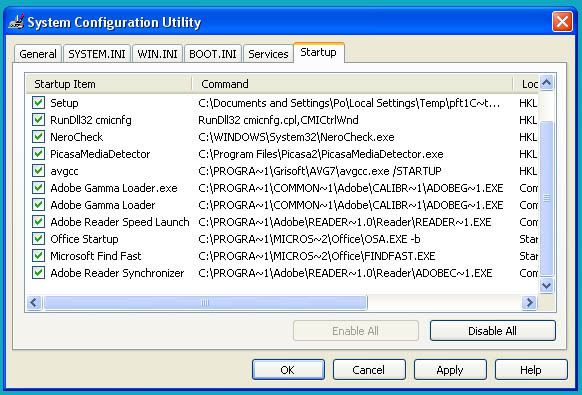 Xiaomayi, which box should I uncheck huh? I've tried unchecking firstly, Adobe Reader speed launch but it didn't work. Then I unchecked Adobe Reader Synchronizer, but it didn't work either. Should I uncheck both?Originally posted by ndmmxiaomayi:Start > Run and type in msconfig