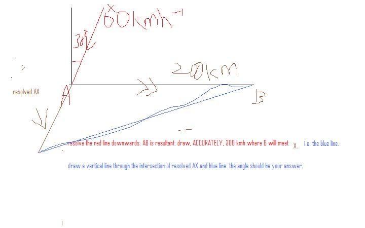 An aircraft flies due east from A to B where AB = 200km. The wind is blowing from the direction 030° at 60km/h. The speed of the aircraft in still air is 300km/h and the pilot sets the course on the bearing X°. Find