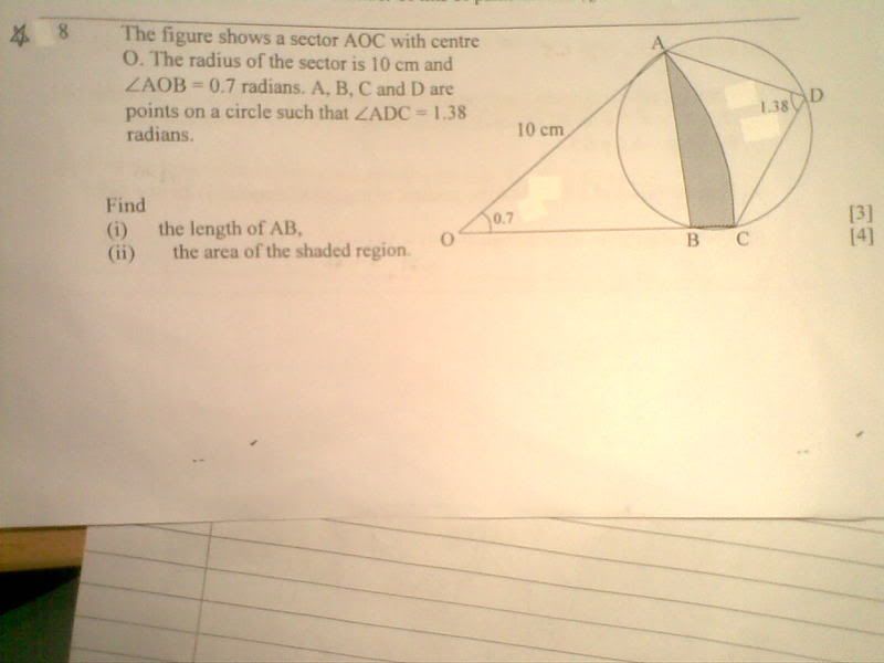 area of shaded area = area of sector - area of unshaded triangle= 1/2 (10^2) (0.7) - 1/2 (10)(6.56)sin(0.68)