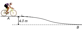 (c) A cyclist, together with his bicycle, has a total mass of 90 kg and is travelling with a constant speed of 15 ms-1 on a flat road at A, as illustrated in the figure below. He then slide down a small slope to B so descending 4.0m.