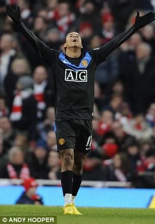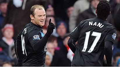 Nani opened the scoring in the 33rd minute when his chip across goal was palmed in by Arsenal goalkeeper Manuel Almunia, before in-form England striker Wayne Rooney swept home a second following a quick counter attack.