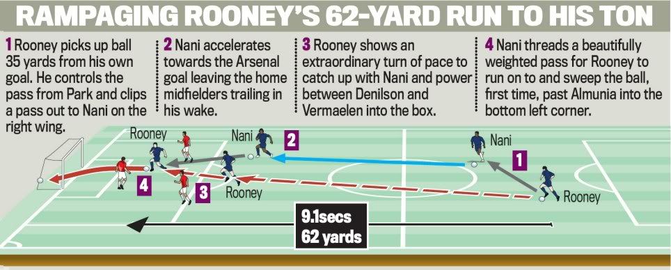 Fabregas' shot following a corner was blocked - and four minutes later United were 2-0 ahead. Again Nani was the provider, dashing clear after picking the ball up from Rooney before squaring it for the England striker to sweep home his 22nd goal of the season, low into the corner.