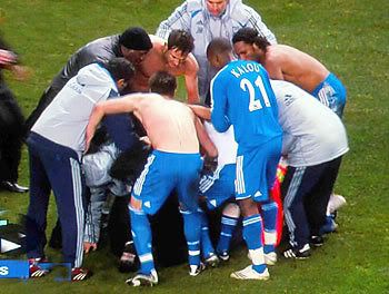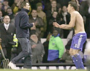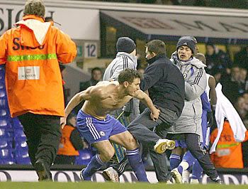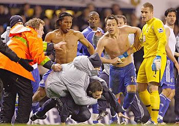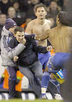 FRANK LAMPARD was attacked by a drunken Tottenham fan as Chelsea celebrated reaching the FA Cup semi-finals last night.The England star had to duck a punch thrown at him by a thug who ran on to the pitch. Tempers spilled over after Chelsea had clinched a 2-1 win in this quarter-final replay to book a last-four clash against Blackburn.