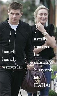 HANDS, REF! England ace Steven Gerrard tries some man-to-tran marking as he grabs a gender bender's fake boobs. The Liverpool star made his play for transvestite Martine McClutchbag's twin strikers as he passed "her" outside a gay bar on a night out with wife Alex Curran.