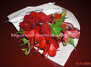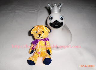 Starter for me was Assorted Hors-d'oeuvres @ ¥2,250. I was delighted with the selection of roast beef, smoked duck, parma ham, sashimi. It was simply delicious. For main course, I chose the Roasted Seafood with Sauteed Tomato & Green Salad @ ¥2,620. The dish comprised of a crab claw & scallop with lots of greens & I was happy with my choice. The Strawberry Parfait @ ¥1,680 was simply too sweet. I picked that simply because it was written on the menu as '人気No.1ã�§ã�™', meaning 'Most popular choice'. I was delighted to be presented a small bouquet of flowers just before leaving the parlour. Well, dinner was really nice. I thanked my friend for the wonderful meal & went back to my hotel. When I returned to my room & finally had time to settle down, I saw this cute little teddy sitting on my bed. For a moment, I've completely forgotten about my Conrad bear collection. This bear looked different from the others I have, this is much smaller & it's so cute. I immediately dashed to the shower room to find my rubber duckling.