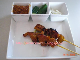 The plane pulled back punctually & I was airborne in no time. My requested glass of Fruit Spritzer was served soon after we reached cruising level. I made myself comfortable by stretching out on the foot rest area in front of me, which is part of the flat bed. Soon, a prelude of local Satay was served. A local delight of skewered slices of chicken or mutton that are grilled to perfection & served with a tantalizing peanut sauce.