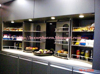 The spacious restrooms carry a variety of amenities. Freshen up with custom-designed toiletries - eau de cologne, aftershave lotion, mouthwash & moisturising hand lotion. Each separate drawers contain razors & shaving cream, toothbrush sets, combs, air-sick bags & feminine hygiene items.... all at your dispense.