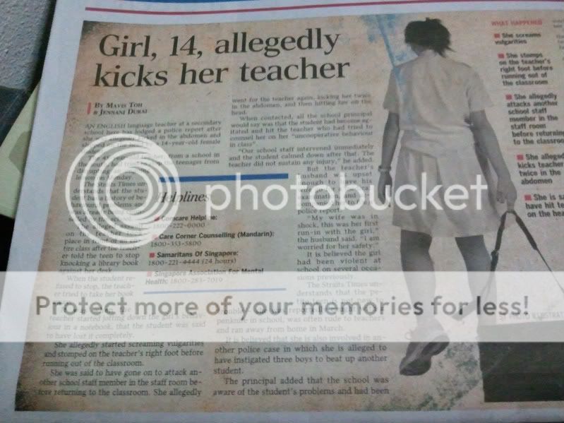 Originally posted by Junyang700:Haha... I wonder why students bullying students over a period of time only gets into Stomp Headlines... but a student kicking a teacher for the first time ends up on front page of Straits Times Home Section....