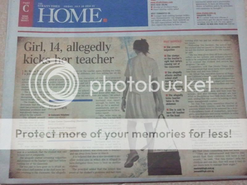 Haha... I wonder why students bullying students over a period of time only gets into Stomp Headlines... but a student kicking a teacher for the first time ends up on front page of Straits Times Home Section....