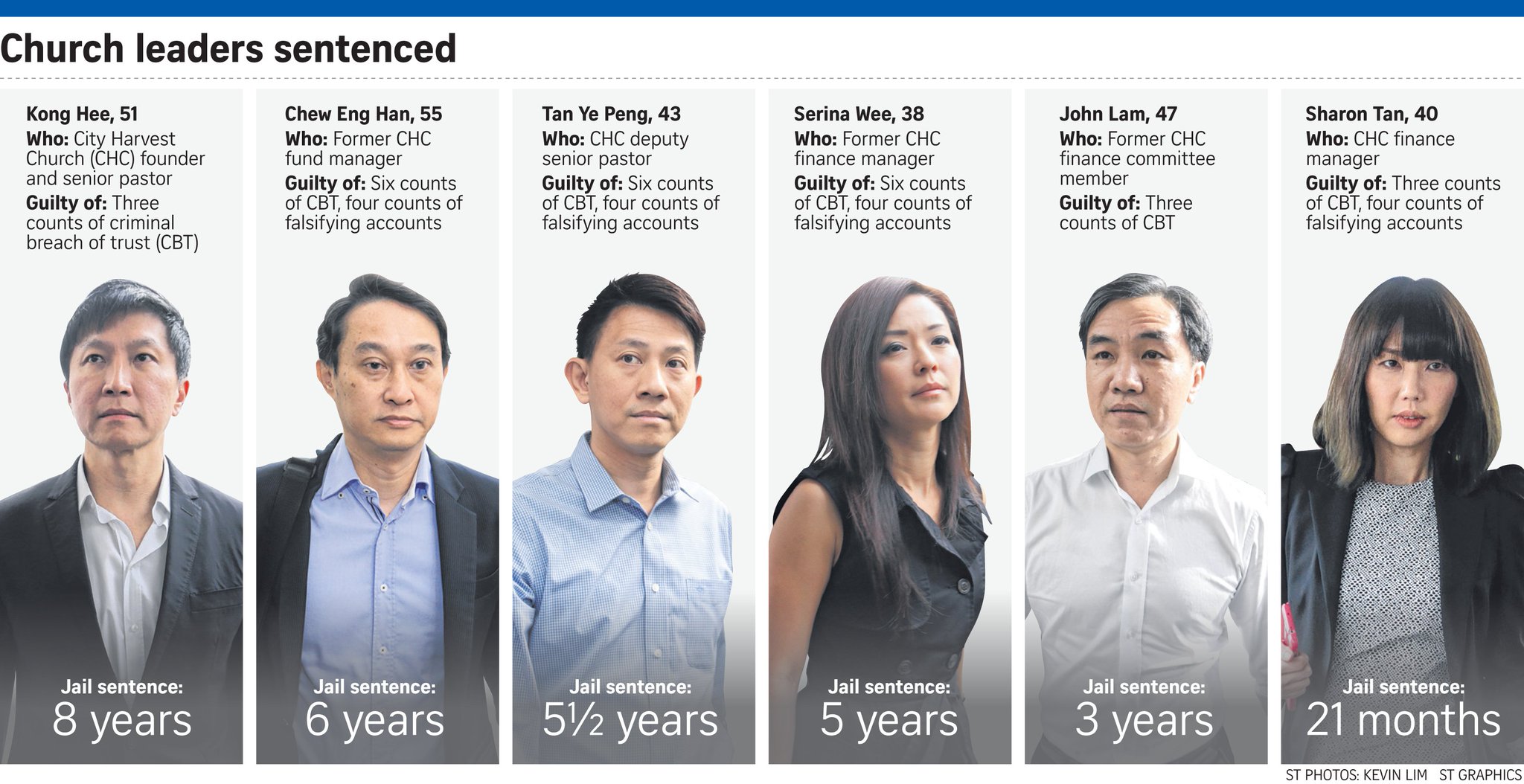 The six leaders of the church - founder and senior pastor Kong Hee; deputy senior pastor Tan Ye Peng; former church board member and Chairman of CHC's Investment Committee John Lam Leng Hung; former church board and CHC Investment Committee member Chew Eng Han; and former finance managers Sharon Tan and Serina Wee - were each convicted on between three and 10 counts of criminal breach of trust and falsifying church accounts.