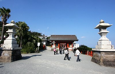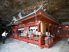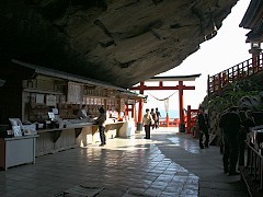 Udo Shrine, located on the Nichinan Coast south of Miyazaki City, is dedicated to Yamasachihiko, the father of Emperor Jimmu, the mythical first emperor of Japan. This brightly painted shrine is set in a cave on the side of a cliff overlooking the ocean and so enjoys a spectacular view. There are a few legends concerning Emperor Jimmu and this cave, although it is unclear whether he was born here or visited here as a baby. However, the one thing the stories have in common are the breast shaped rocks in the cave wall which are said to have nourished him.