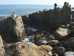 Drinking the water that drips from these rocks is thought to be beneficial for pregnancy, childbirth, nursing and women hoping to have a child. The shrine is also thought to be fortunate for couples and newlyweds. Outside the cave is a terrace overlooking the ocean. Among the rocks below is a target marked by rope into which people try to throw small ceramic undama, or lucky balls (available at the shrine for a small fee). Women throw with their right hand while men throw with their left, and landing an undama in the target brings good luck.