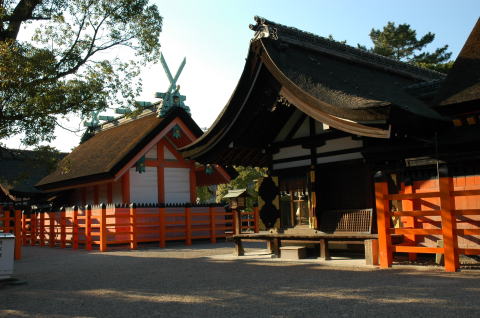 One of Japan's oldest shrines founded in the 3rd century, displaying a purely Japanese shrine architecture prototype (sumiyoshi-zukuri).