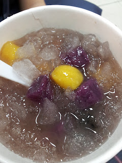 This is the Yu-Yuan from one of the two really famous stores that sell it at Jiufen (�份). They are essentially colorful and chewy balls made from taro. You can choose to either have it served cold or hot.. being deathly afraid of anything about 70 degrees, I opted for the extra ice. They incorporate a good mixture of sweet red beans, mung beans and or peanuts that help to give the dish even more flavor. The texture of the taro balls goes well with the mixture of beans. Thumbs up all around.