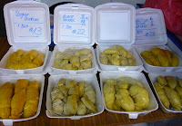 The tables and stools for eat-in clients were places alongside under a shady but uneven tree-lined path outside a beer-garden/ market sort of joint. Quite a good location as the joint looked quiet or closed during the day, leaving them full use of the space. Not many clients, but then again, maybe they catch the spill overs later in the day, especially when the other stall sells out and goes home first.