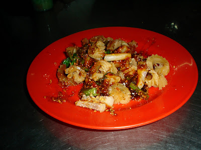 The famous Sotong KangKung ( Cuttlefish KangKong) hawker stall in located in "Song River " Coffee Shop.This is a piece of art. The young man created the decoration of this popular Penang hawker food called Sotong KangKung.