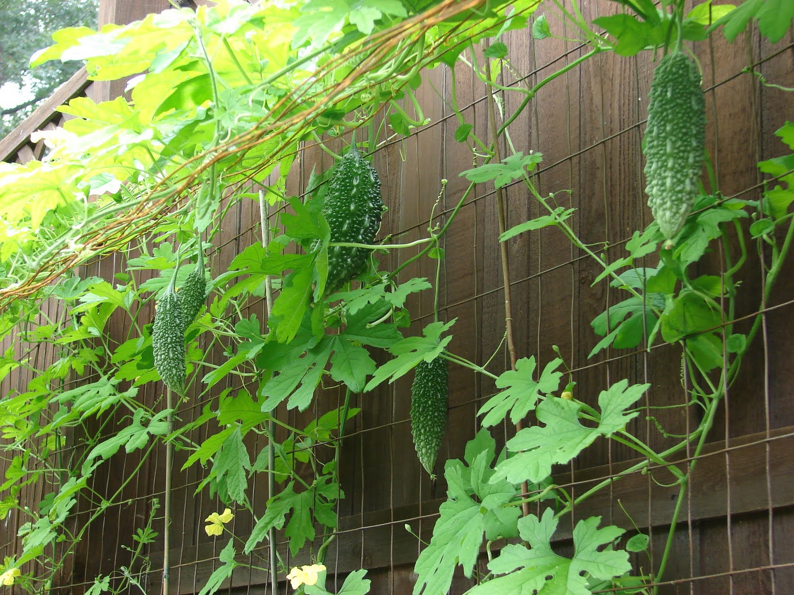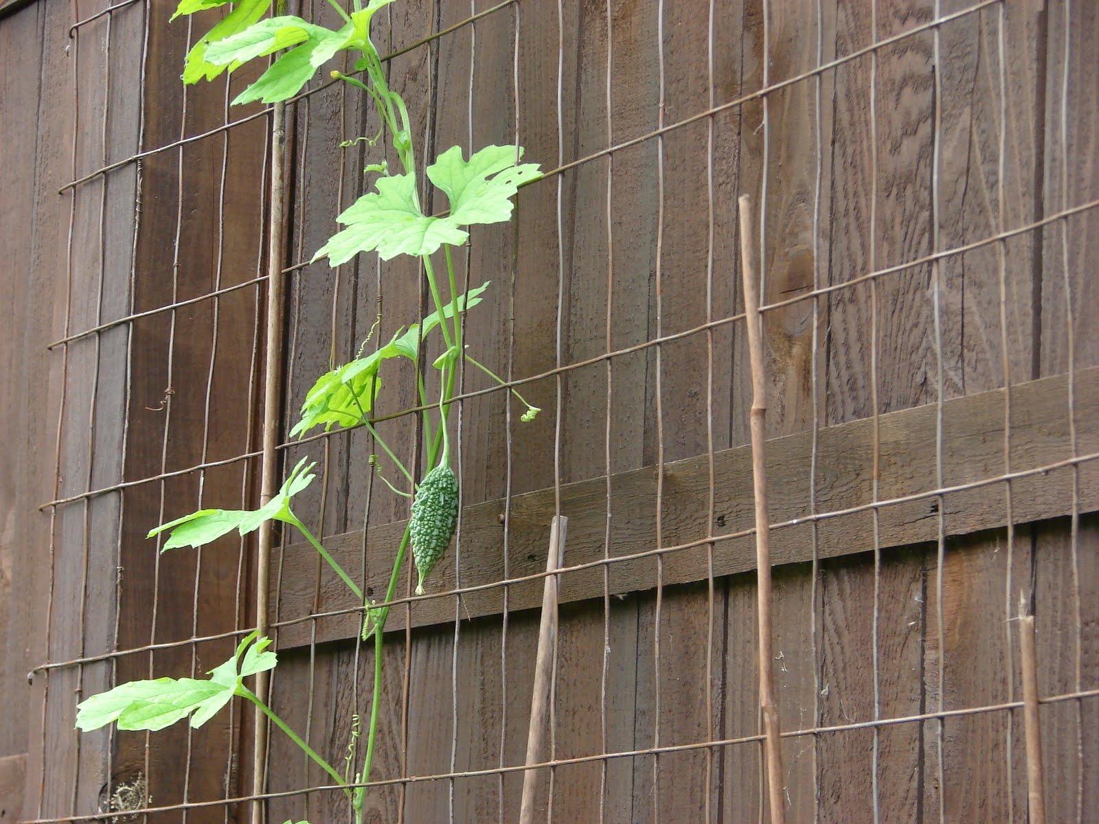 Prepare a garden site that has good rich soil with lots of compost worked into it. Bitter melons can be a host to fungal diseases, so it helps to keep the ground surface dry. Place a strong trellis or support system into the ground that will allow the bitter melon to grow about 6 feet high. Augment the garden soil with compost or dried manure. Add iron suplement to sweeten the soil if you live in an area like us with moderate iron levels in the soil. This will promote that bright green tone in the fruit and leaves of the plants. Bitter melon prefers soil that is rich but drains well. Make sure the location receives six to eight hours of sunlight every day.