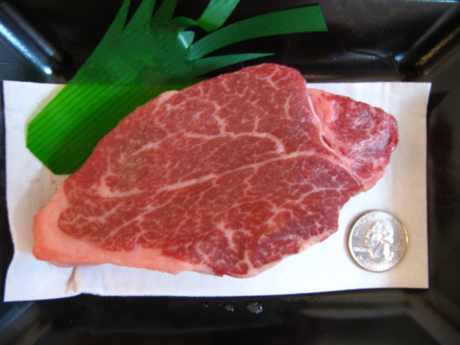 Wagyu ( 和牛 wagyÅ« ? ) refers to several breeds of cattle genetically predisposed to intense marbling and to producing a high percentage of oleaginous unsaturated fat . Also known as, the meat from Wagyu cattle is known worldwide for its marbling characteristics, increased eating quality through a naturally enhanced flavor, tenderness and juiciness, and thus a high market value. Grocery stores in the United States will sell cuts of American Wagyu for $40/lb to $150/lb (€64/kg to €240/kg).